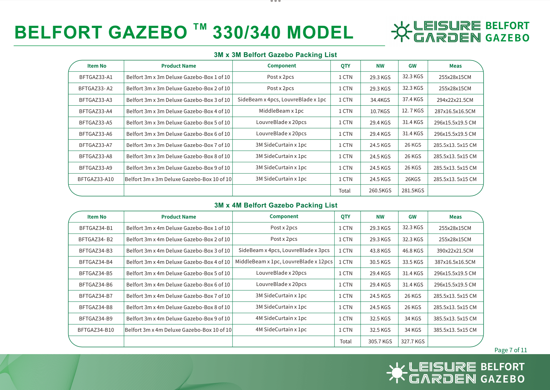 This warranty is the only warranty offered by Leisure Garden and excludes any other implied or oral undertakings. Except as described above, this warranty does not cover defects or damage due to normal wear and tear, improper installation, alternation without Leisure Garden’s prior written consent, accident, acts of god, misuse, abuse, commercial or industrial use, use of an accessory not approved by Leisure Garden, failure to follow Belfort Gazebo or Owner’s Manual, or repairs made or attempted by anyone other than an authorised representative of Leisure Garden, Leisure Garden or its agents will not be liable for any incidental or consequential loss or injury. Leisure Garden will not be liable for costs associated with but not limited to building alterations, removal costs, delivery costs or labour costs associated with the replacement or repair of the gazebo and parts.